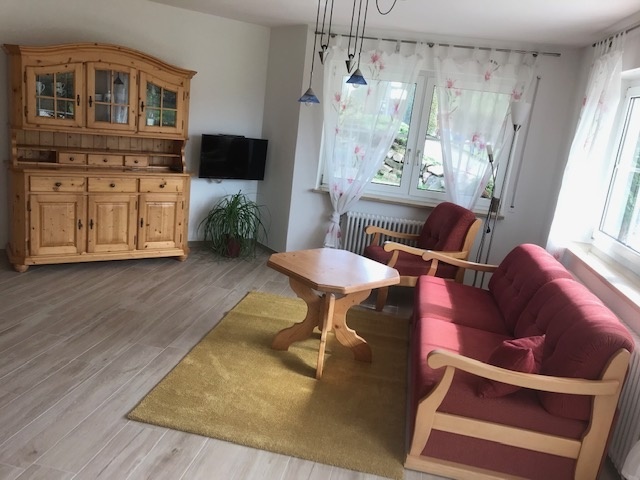 Ferienwohnung Nr. 1 im Erdgeschoss für 2 Personen, die Wohnung ist barrierefrei, hat keine Stufen, eine begehbare Dusche und eine große Erdterrasse auf der man mit der Sonne wandern kann und immer ein sonniges Plätzchen findet. Preis: 55 € für zwei Personen zzgl. Kurtaxe pro Person/Nacht. Jede weitere Person 10 Euro