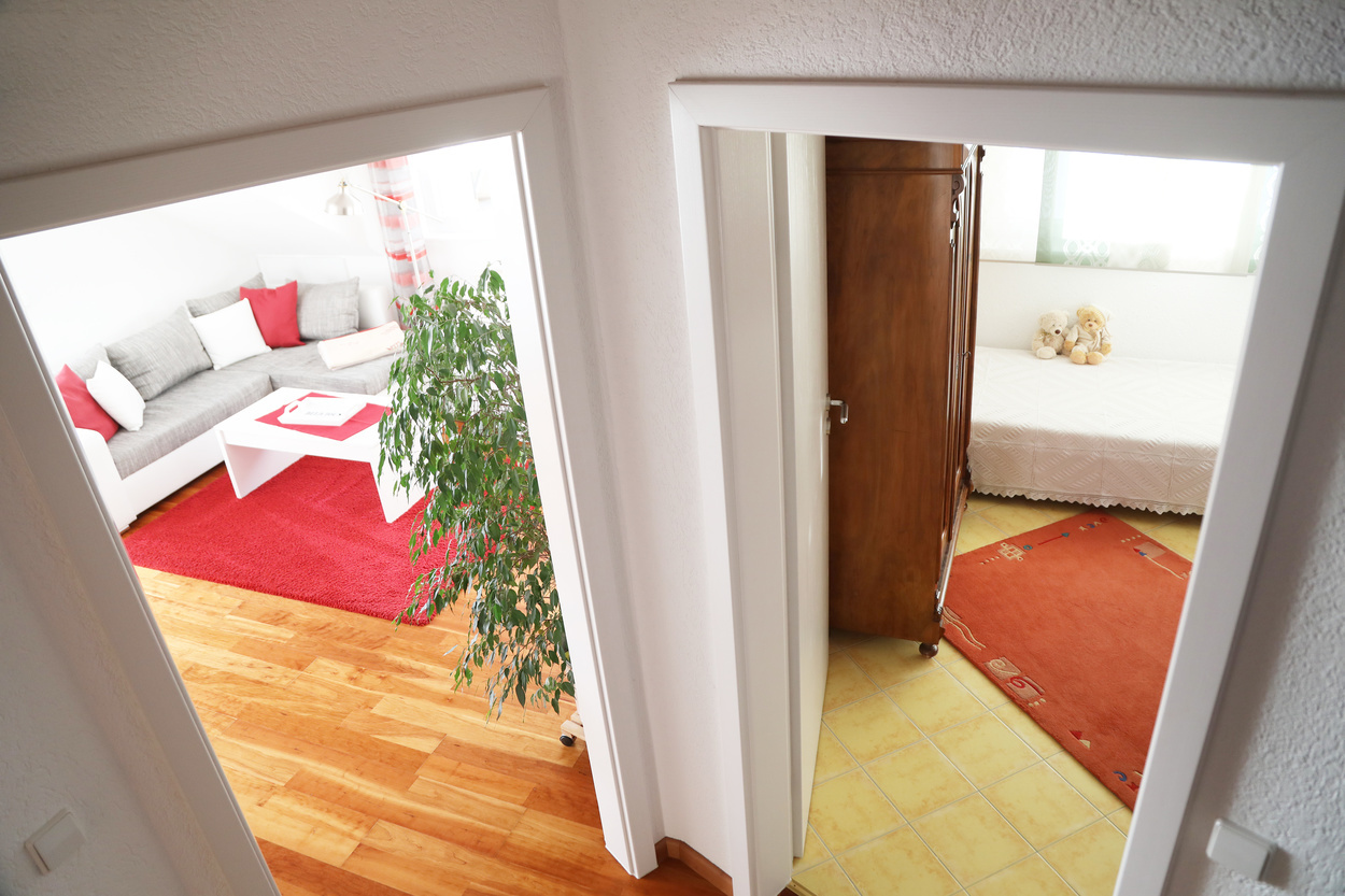 Es sind ein Elternzimmer mit TV, ein Kinderzimmer mit Doppelstockbett und einem Einzelbett, sowie ein Wohnzimmer mit TV vorhanden sowie eine separate voll ausgestattete Küche mit Kaffeemaschine und einem Balkon mit toller Aussicht. Alle Räume sind mit elektrischen Rollladen ausgestattet. Es gibt ein extra Zimmer mit einem Doppelbetten auf dem Dachboden, dass zusätzlich gebucht werden kann.