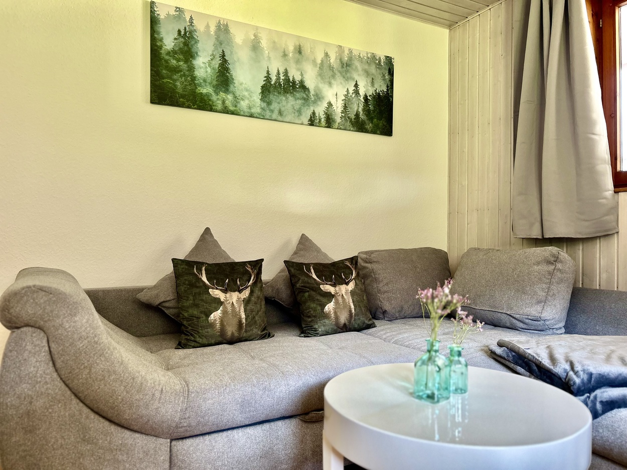 Unsere frisch renovierte, ebenerdige Ferienwohnung Bergquelle ist hell, freundlich und ideal für Familien. Sie bietet Platz für bis zu 5 Personen, ein großes XXL-Sofa zum Entspannen sowie eine Erdterrasse. Buchbar ab 5 Nächten.