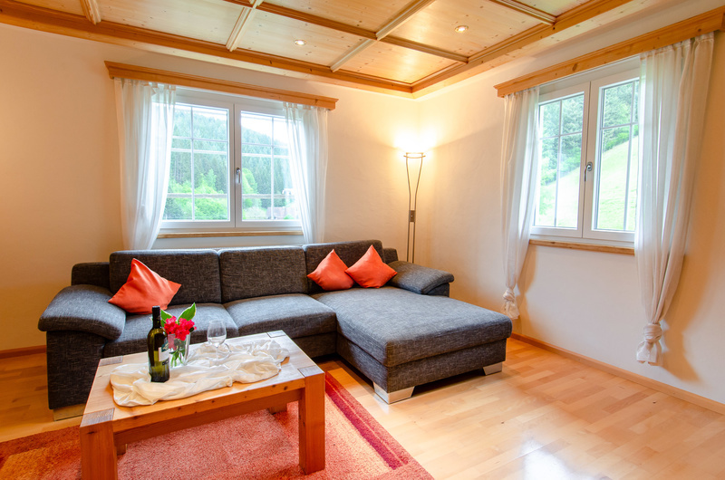 Die Ferienwohnungen auf dem Fussbauernhof befinden sich in zwei separaten Ferienhäusern neben dem Hofgebäude; Balkon oder Terasse gewähren freien Blick ins Tal.