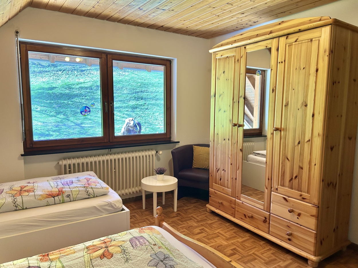 Hinweise: Sehr ruhige Waldrandlage, Alleinstellungsmerkmal Einzelhof. Großer hofeigener Spielplatz, 2 Grillstellen, Liegewiese zum Ausruhen. Gartenhäusle mit Spiel-und Malecke ,Riesentrampolin , Himmelsliege für 3 Personen und Tischtennis .Tiere wie Ziegen ,Hühner und Hasen , Katzen , 1 Minishetypony ,2 Pferde, Milchkühe und Kälber .