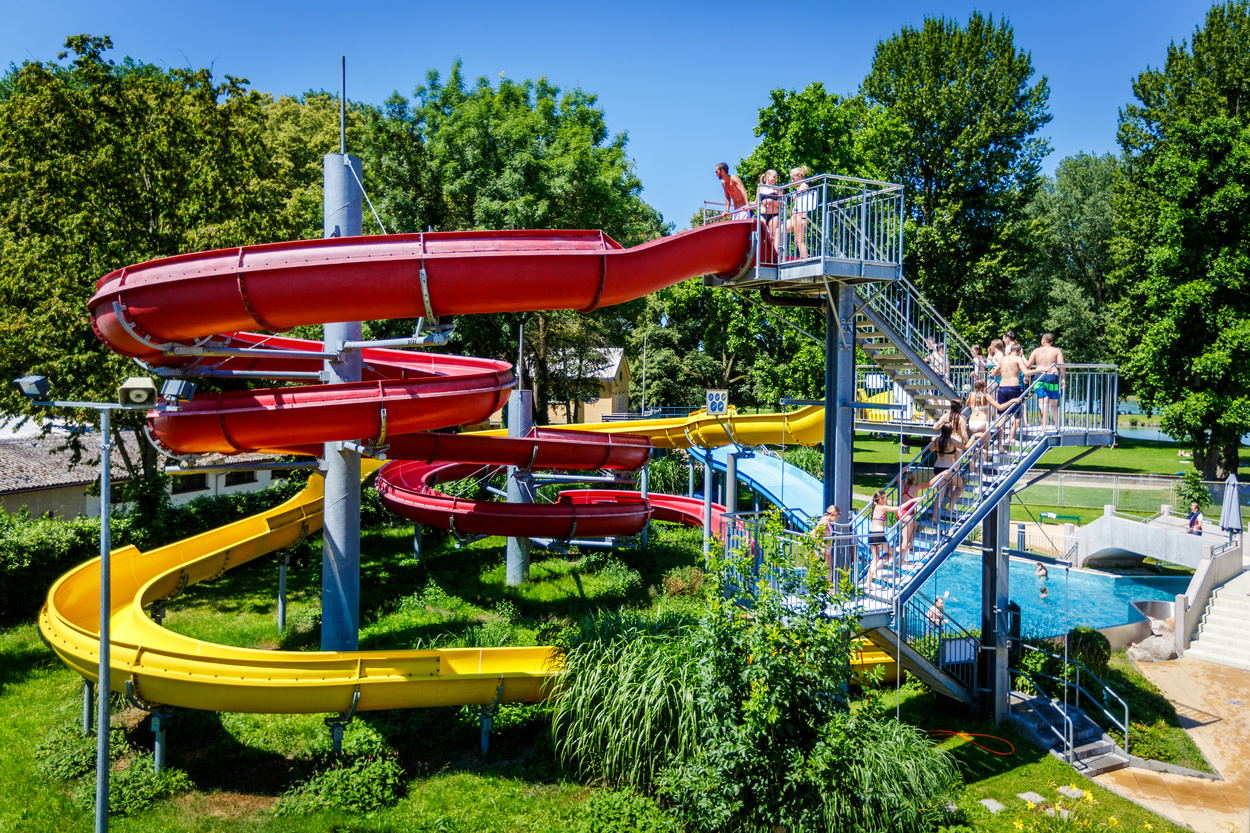 • Erlebnsibecken mit Riesen­rut­sche, Strömungs­ka­nal und Brodel­ele­menten
